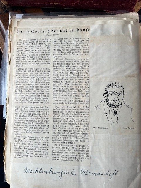 Als wir dann nach Blankenburg a. H. [am Harz] zogen, wurde die Freundschaft wieder erneuert. Corinth besuchte uns dort öfter, auch mit seiner ihm neu angetrauten Gattin Charlotte Berend. Aus dieser Zeit besitze ich drei sehr amüsante, von Corinth gezeichnete Postkarten. Damals entstand auch die hier zum ersten Male veröffentlichte Federzeichnung. Mein Mann zeichnete einiges mit der Rohrfeder. Als Corinth das sah, meinte er, er möchte es auch wohl mal „mit dem Dings da“ versuchen. Es gefiel ihm sehr gut, und diesem ersten Versuch verdanken wir die Zeichnung.
